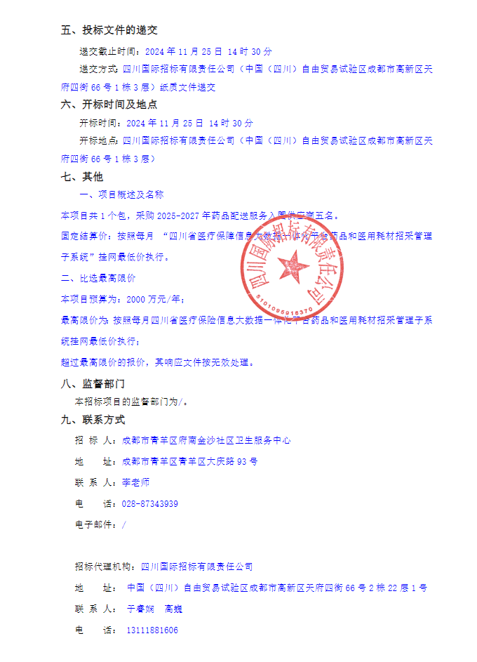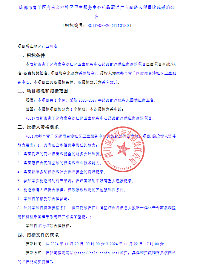 【成都市青羊区府南金沙社区卫生服务中心】四川省成都市青羊区府南金沙社区卫生服务中心药品配送供应商遴选项目比选采购公告
