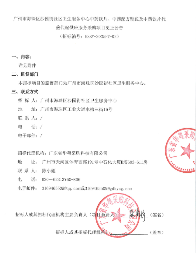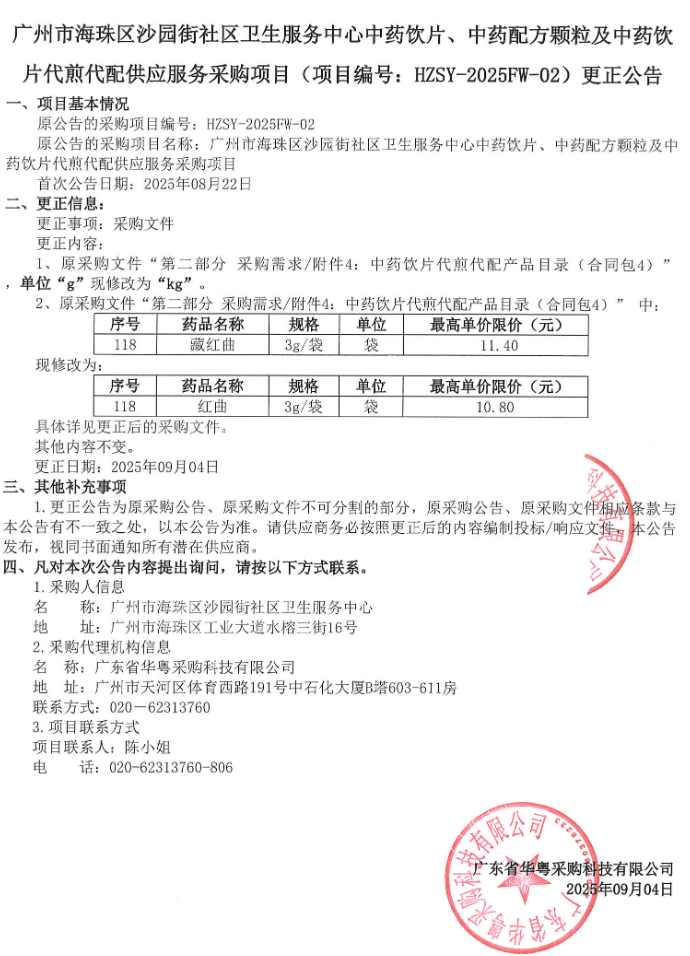 【广州市海珠区沙园街社区卫生服务中心】广东省广州市海珠区沙园街社区卫生服务中心中药饮片、中药配方颗粒及中药饮片代煎代配供应服务采购项目更正公告