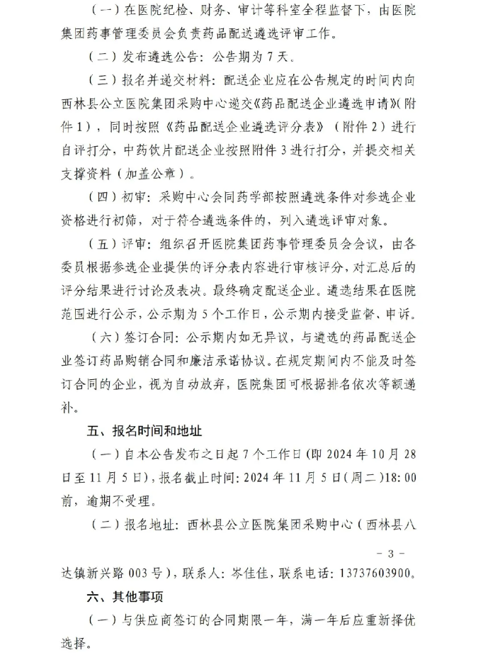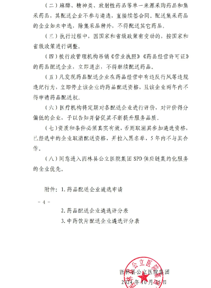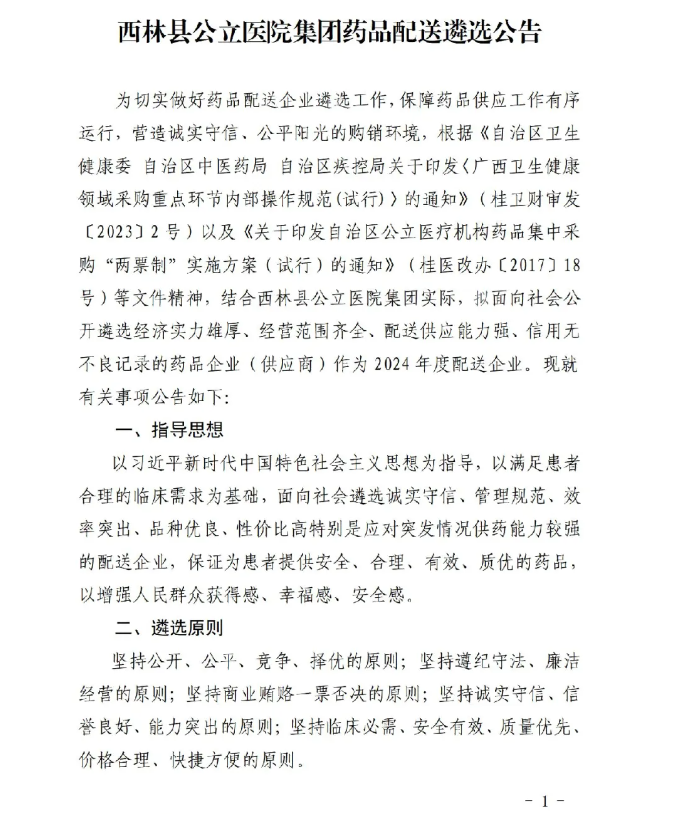【百色市西林县人民医院】广西壮族自治区百色市西林县公立医院集团药品配送遴选公告