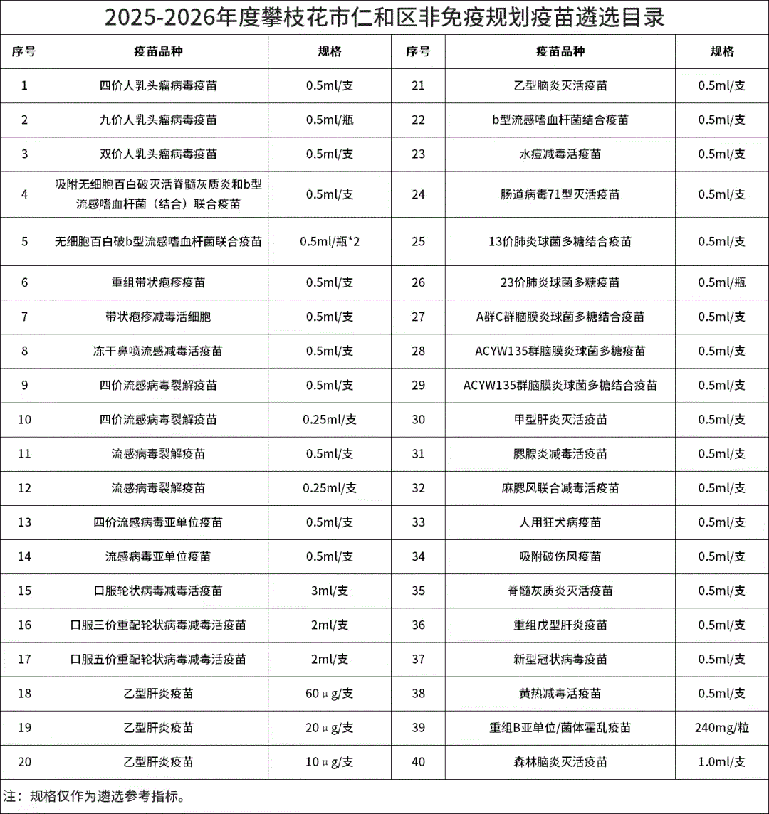 根据《中华人民共和国疫苗管理法》《四川省卫生健康委员会关于印发疫苗全程管理风险防控工作方案(2023年版)的通知》《四川省卫生计生委关于修改〈四川省非免疫规划疫苗挂网阳光采购实施方案〉的通知》等文件要求,为进一步依法、规范、有序做好攀枝花市仁和区2025-2026年度非免疫规划疫苗采购工作,防范疫苗管理相关风险,经报攀枝花市仁和区卫生健康局同意,拟于近期召开辖区“2025-2026年度仁和区非免疫规划疫苗的遴选工作”会议,遴选会议时间、地点另行通知。现将有关事宜公告如下。