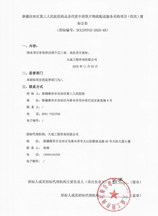 【新疆自治区第三人民医院】新疆自治区第三人民医院药品及代煎中药饮片物流配送服务采购项目(四次)废标公告