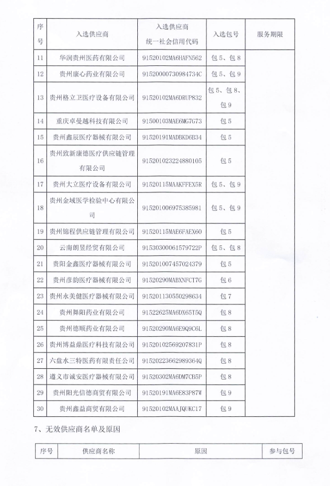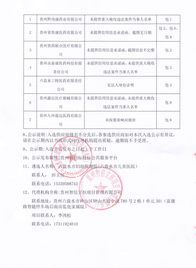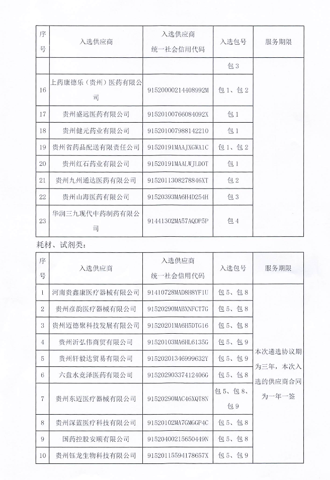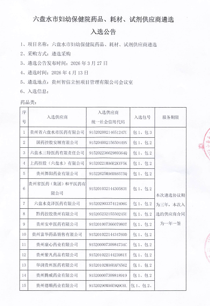 【六盘水市妇幼保健院】贵州省六盘水市妇幼保健院药品、耗材、试剂供应商遴选入选公告