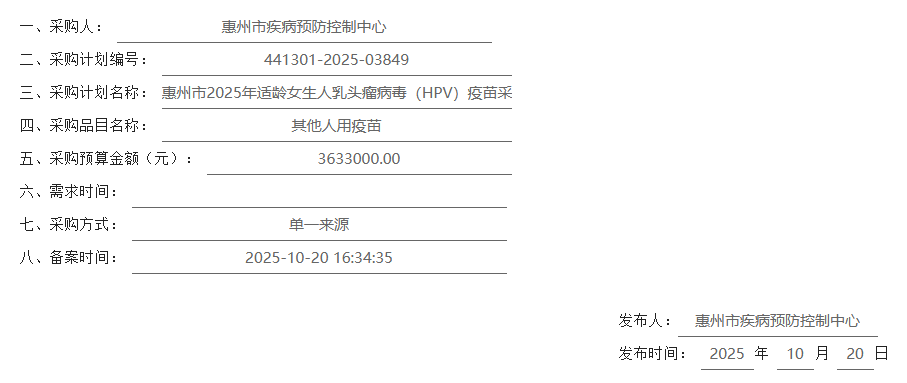 【惠州市疾病预防控制中心】广东省惠州市2025年适龄女生人乳头瘤病毒(HPV)疫苗采购项目
