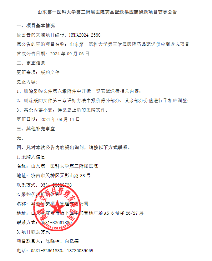【山东第一医科大学第三附属医院】山东第一医科大学第三附属医院药品配送供应商遴选项目招标公告第一次变更公告