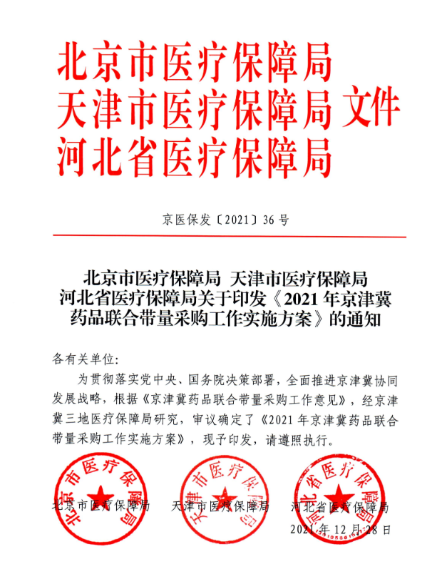 【河北】北京市医疗保障局天津市医疗保障局河北省医疗保障局关于印发《2021年京津冀药品联合带量采购工作实施方案》的通知