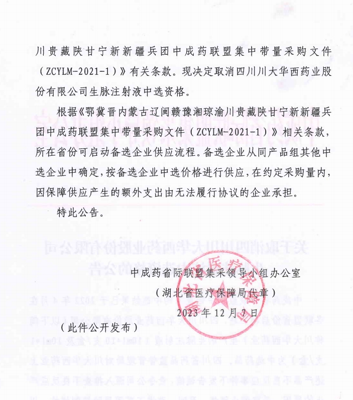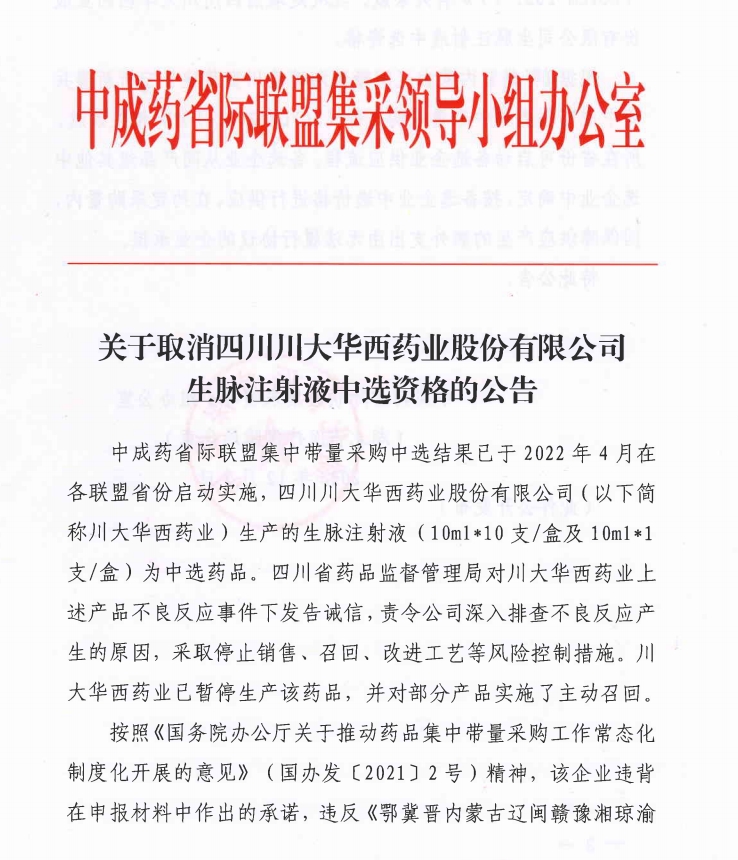 按照《国务院办公厅关于推动药品集中带量采购工作常态化制度化开展的意见》(国办发〔2021〕2号)精神,该企业违背在申报材料中作出的承诺,违反《鄂冀晋内蒙古辽闽赣豫湘琼渝川贵藏陕甘宁新新疆兵团中成药联盟集中带量采购文件(ZCYLM-2021-1)》有关条款。现决定取消四川川大华西药业股份有限公司生脉注射液中选资格。
