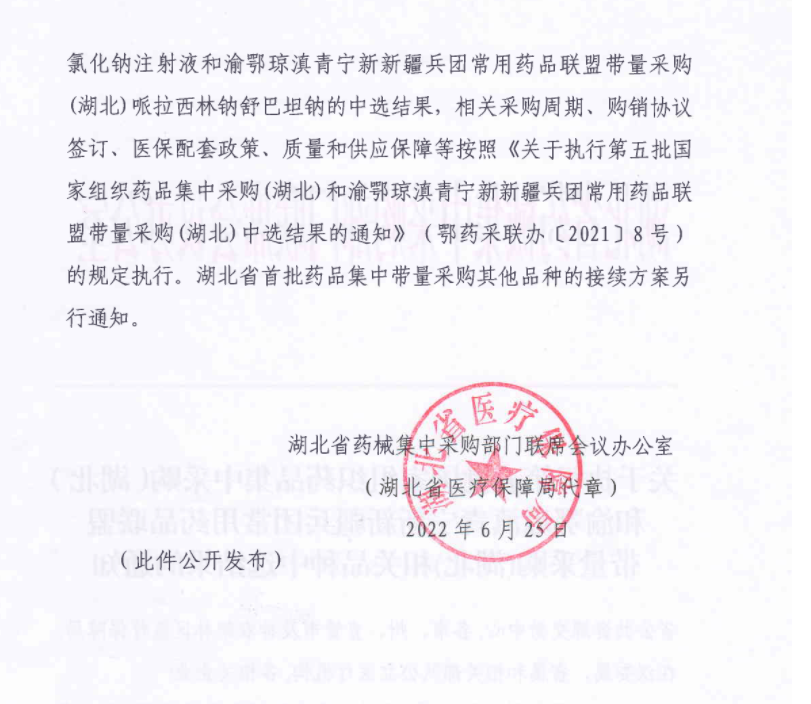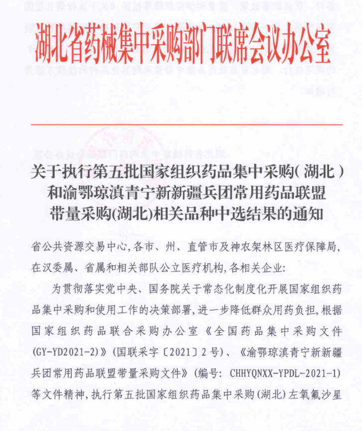 现将省药械集中采购部门联席会议办公室《关于执行第五批国家组织药品集中采购(湖北)和渝鄂琼滇青宁新新疆兵团常用药品联盟带量采购(湖北)相关品种中选结果的通知》转发给你们,请遵照执行。