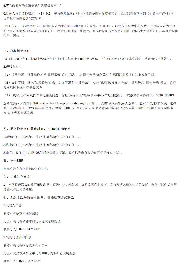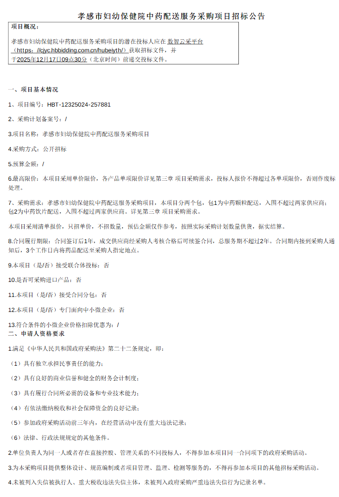 【孝感市妇幼保健院】湖北省孝感市妇幼保健院中药配送服务采购项目招标公告
