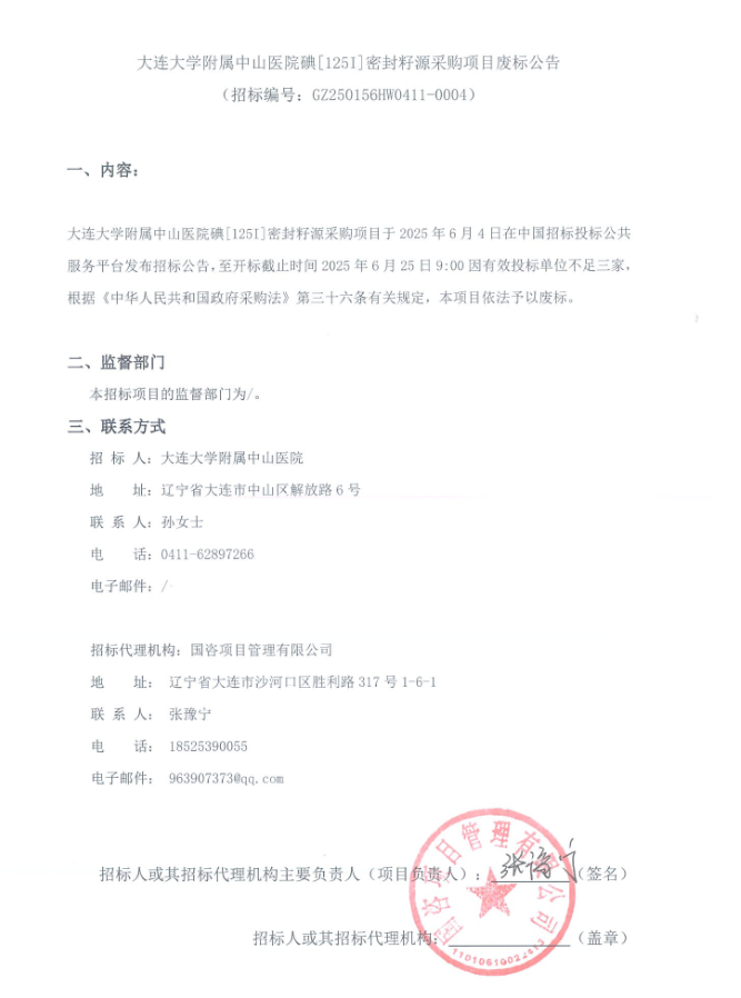 【大连大学附属中山医院】辽宁省大连大学附属中山医院碘〔125I〕密封籽源采购项目废标公告