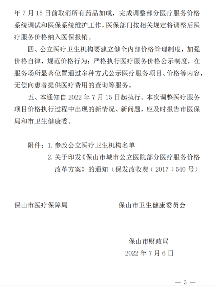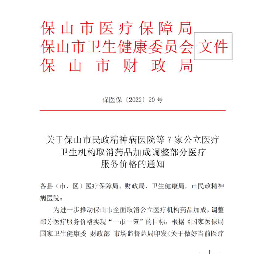 【保山市】 保医保〔2022〕20号关于保山市民政精神病医院等7家公立医疗卫生机构取消药品加成调整部分医疗服务价格的通知