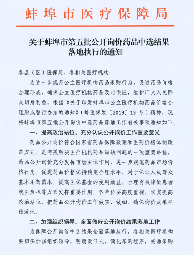 【蚌埠】蚌埠市第五批公开询价药品落地工作的通知