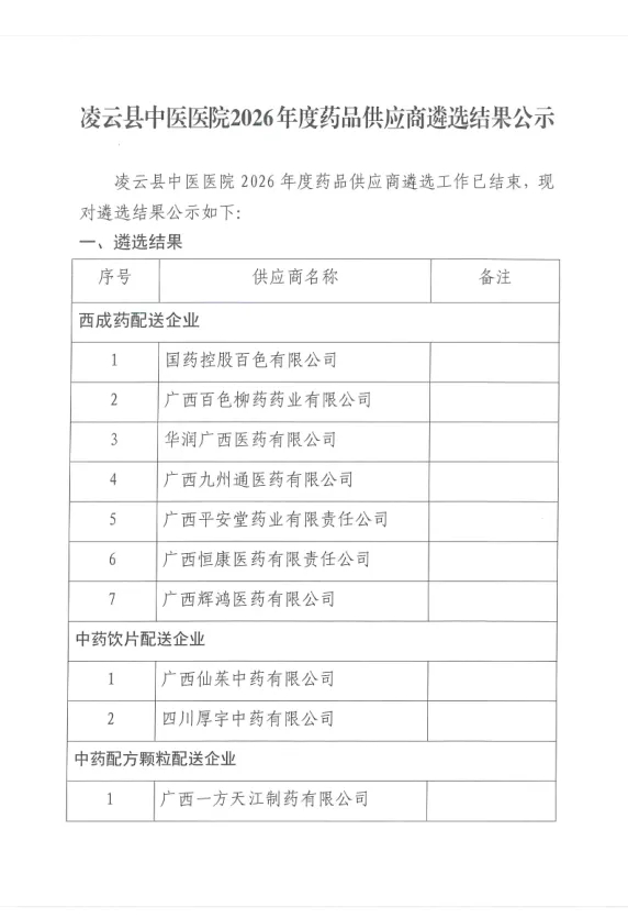 【百色市凌云县中医医院】广西壮族自治区百色市凌云县中医医院2026年度药品供应商遴选结果公示