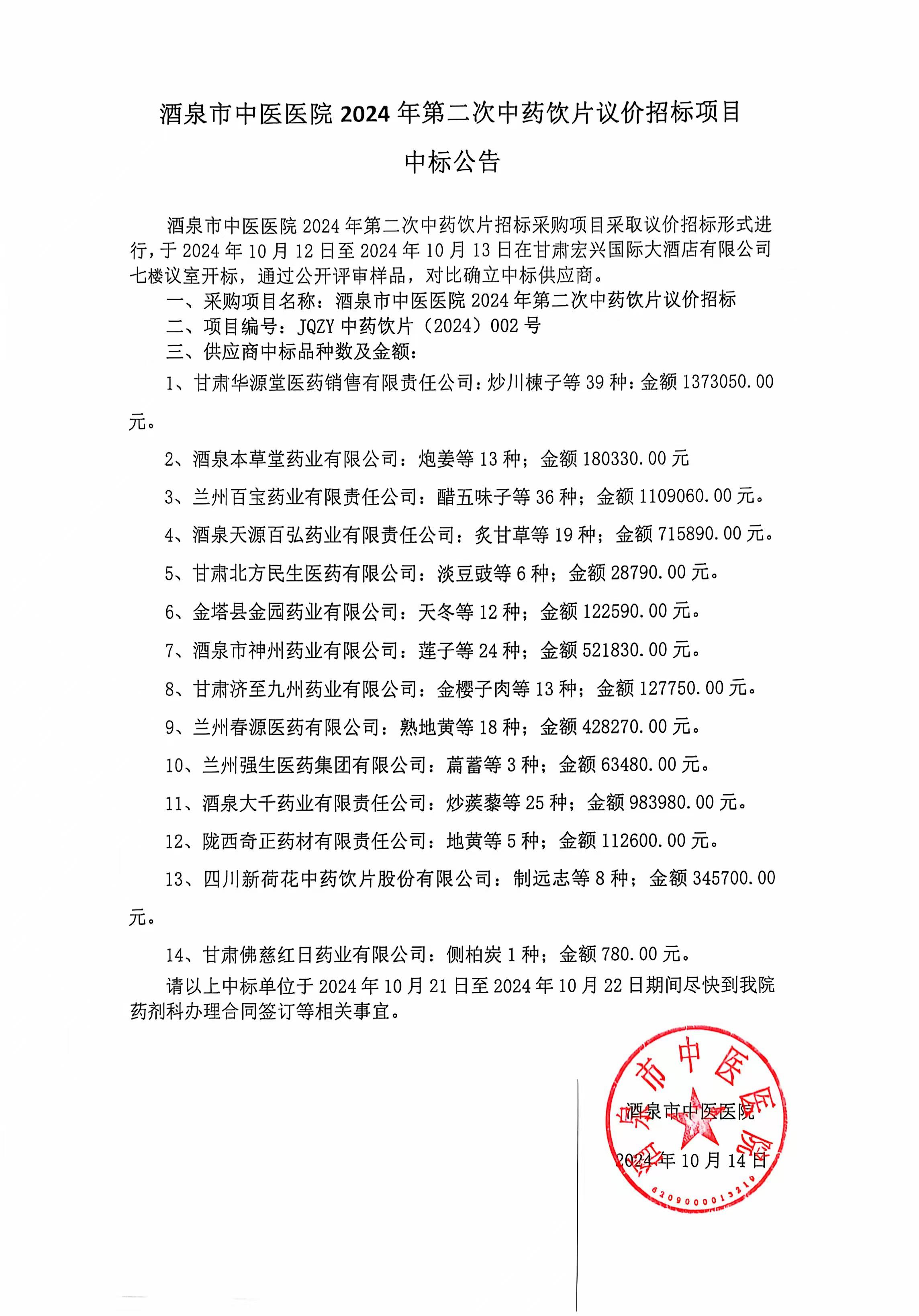 【酒泉市中医医院】甘肃省酒泉市中医医院2024年第二次中药饮片议价招标项目中标公告