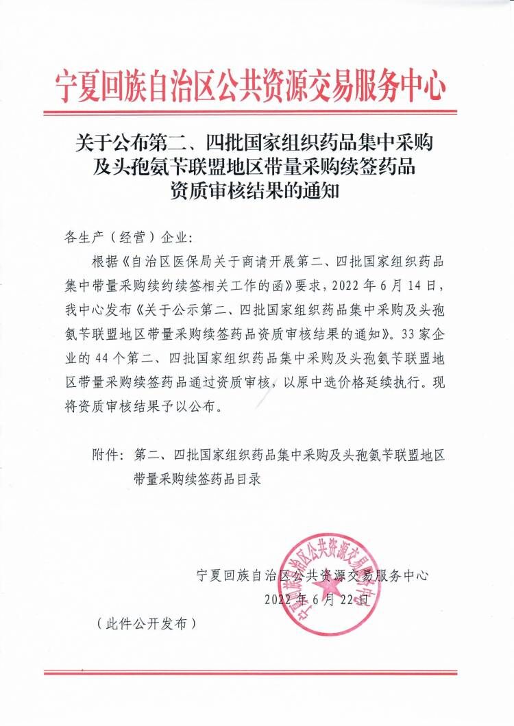 【宁夏】关于公布第二、四批国家组织药品集中采购及头孢氨苄联盟地区带量采购续签药品资质审核结果的通知