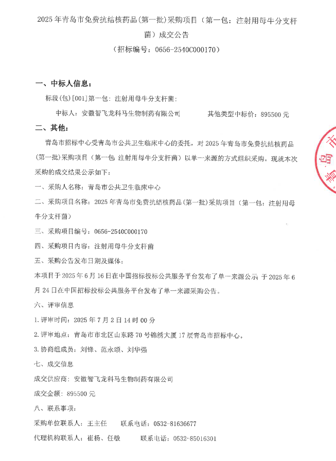 【青岛市公共卫生临床中心】山东省2025年青岛市免费抗结核药品(第一批)采购项目(第一包:注射用母牛分支杆菌)成交公告