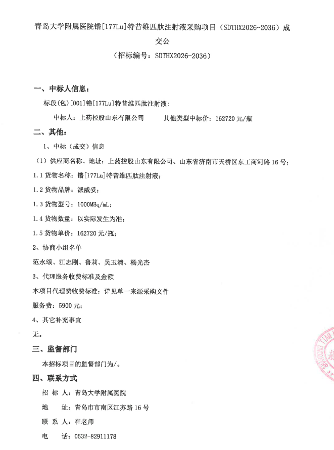 【青岛大学附属医院】山东省青岛大学附属医院镥[177Lu]特昔维匹肽注射液采购项目(SDTHX2026-2036)成交公告