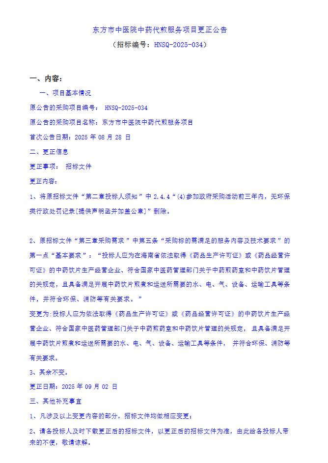 【海南省东方市中医院】海南省东方市中医院中药代煎服务项目更正公告