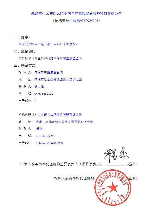 【赤峰市中医蒙医医院】内蒙古自治区赤峰市中医蒙医医院中药免煎颗粒配送服务项目废标公告
