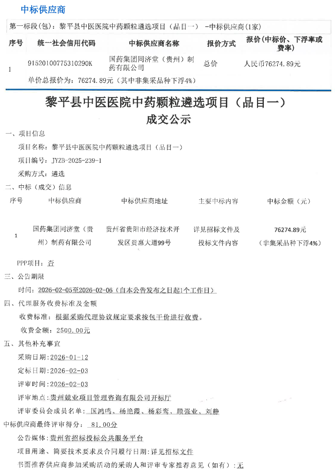 【黔东南苗族侗族自治州黎平县中医医院】贵州省黎平县中医医院中药颗粒遴选项目(品目一)中标(成交)公示