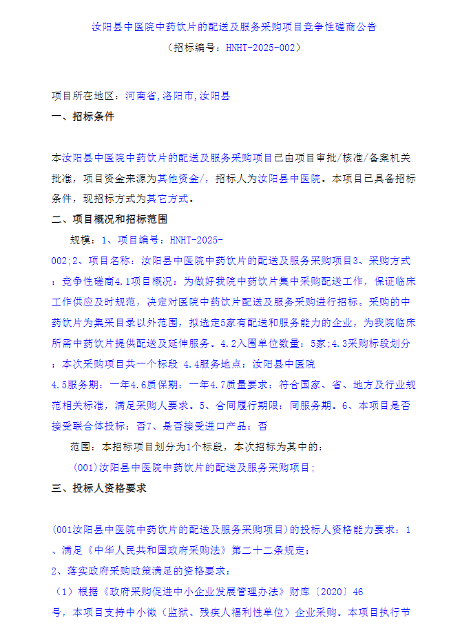 【洛阳市汝阳县中医院】河南省洛阳市汝阳县中医院中药饮片的配送及服务采购项目竞争性磋商公告