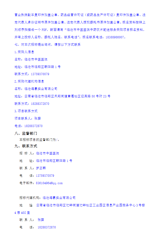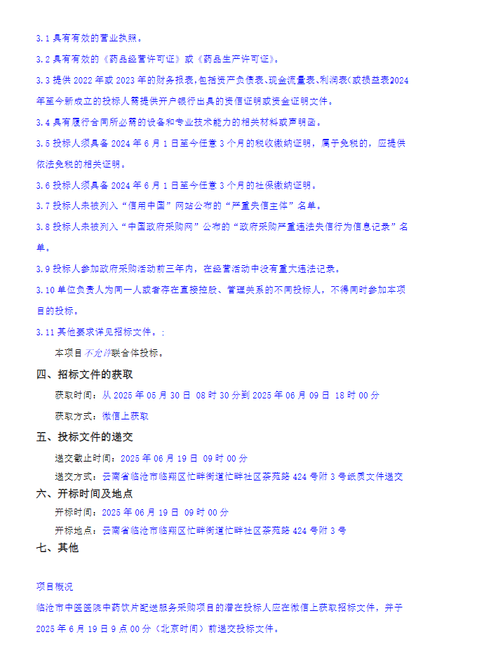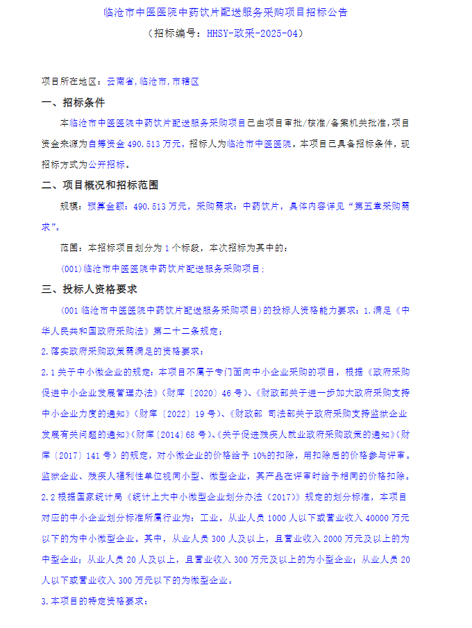 【临沧市中医医院】云南省临沧市中医医院中药饮片配送服务采购项目招标公告