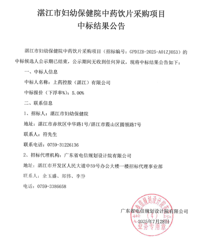 【湛江市妇幼保健院】广东省湛江市妇幼保健院中药饮片采购项目中标结果公告