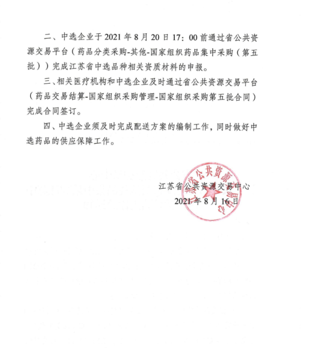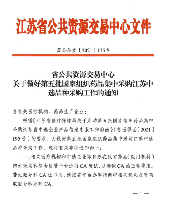 【江苏】2021年江苏省公共资源交易中心关于做好第五批国家组织药品集中采购江苏中选品种采购工作的通知 苏公易发[2021]135号