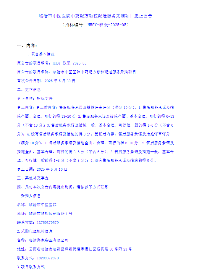 【临沧市中医医院】云南省临沧市中医医院中药配方颗粒配送服务采购项目更正公告1