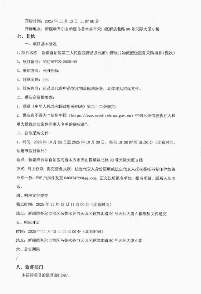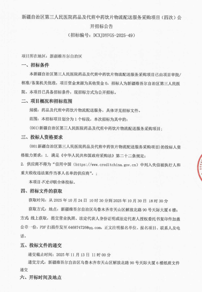 【新疆自治区第三人民医院】新疆自治区第三人民医院药品及代煎中药饮片物流配送服务采购项目(四次)公开招标公告