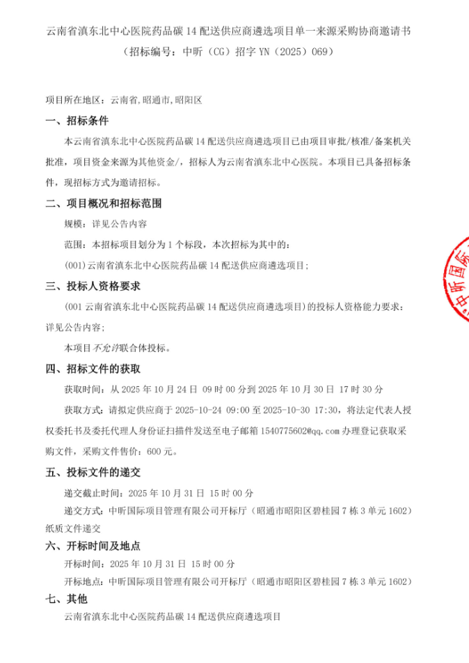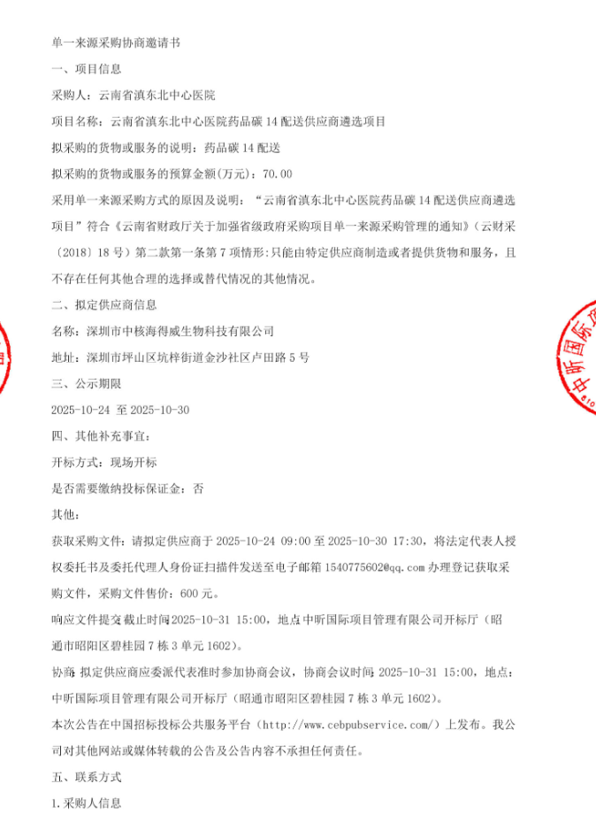 【昭通市滇东北中心医院】云南省滇东北中心医院药品碳14配送供应商遴选项目单一来源采购协商邀请书