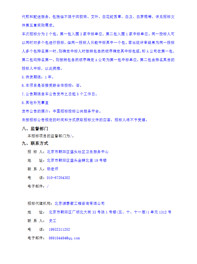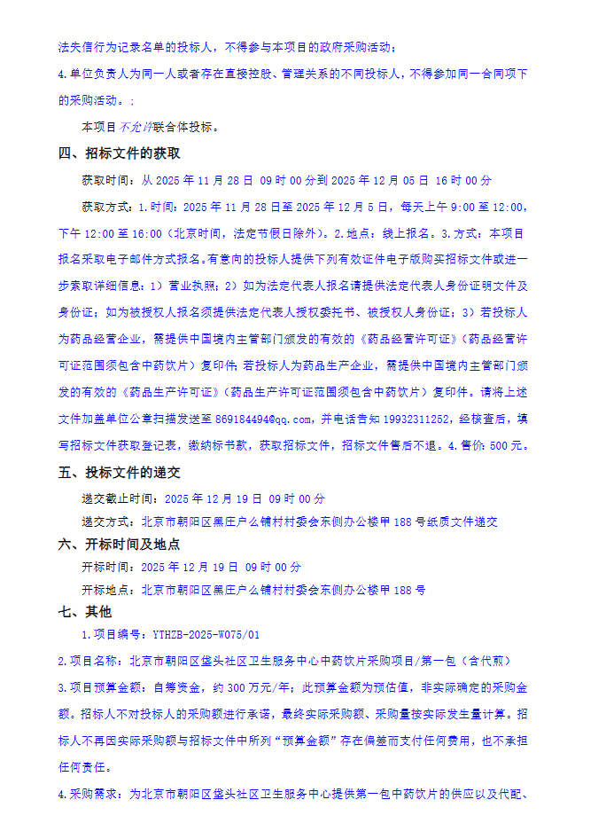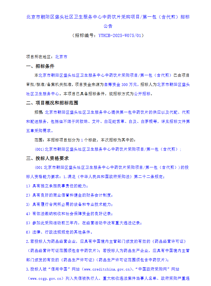【北京市朝阳区垡头社区卫生服务中心】北京市朝阳区垡头社区卫生服务中心中药饮片采购项目/第一包(含代煎)招标公告