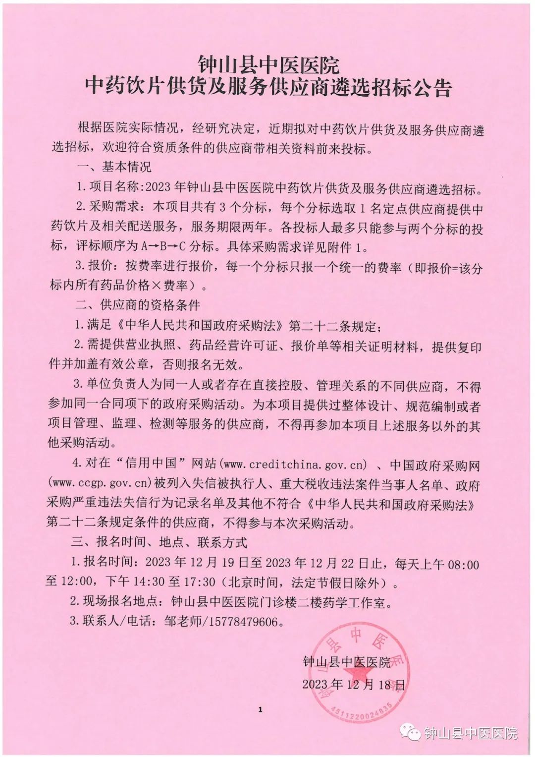 【贺州市钟山县中医医院】广西壮族自治区贺州市钟山县中医医院中药饮片供货及服务供应商遴选招标公告