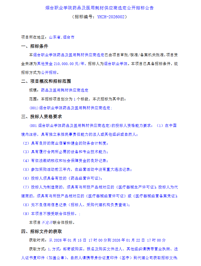 【山东省烟台职业学院】山东省烟台职业学院药品及医用耗材供应商选定公开招标公告