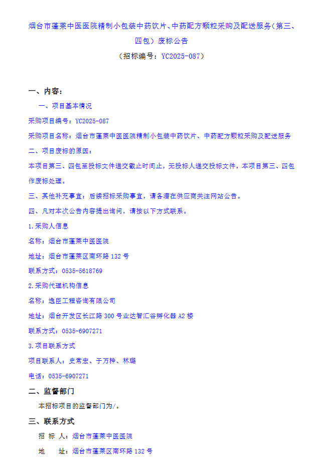 【烟台市蓬莱中医医院】山东省烟台市蓬莱中医医院精制小包装中药饮片、中药配方颗粒采购及配送服务(第三、四包)废标公告