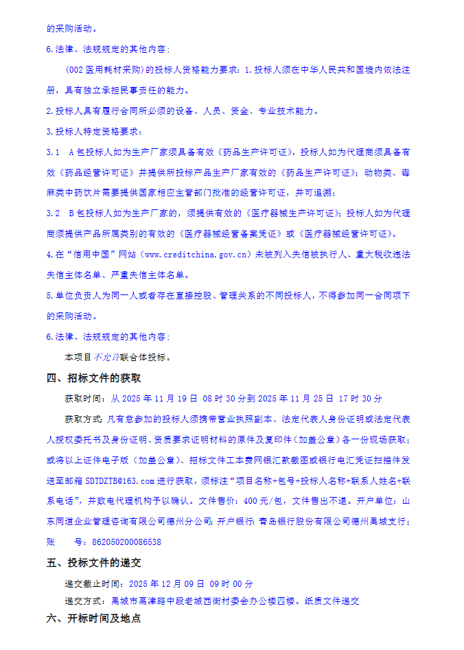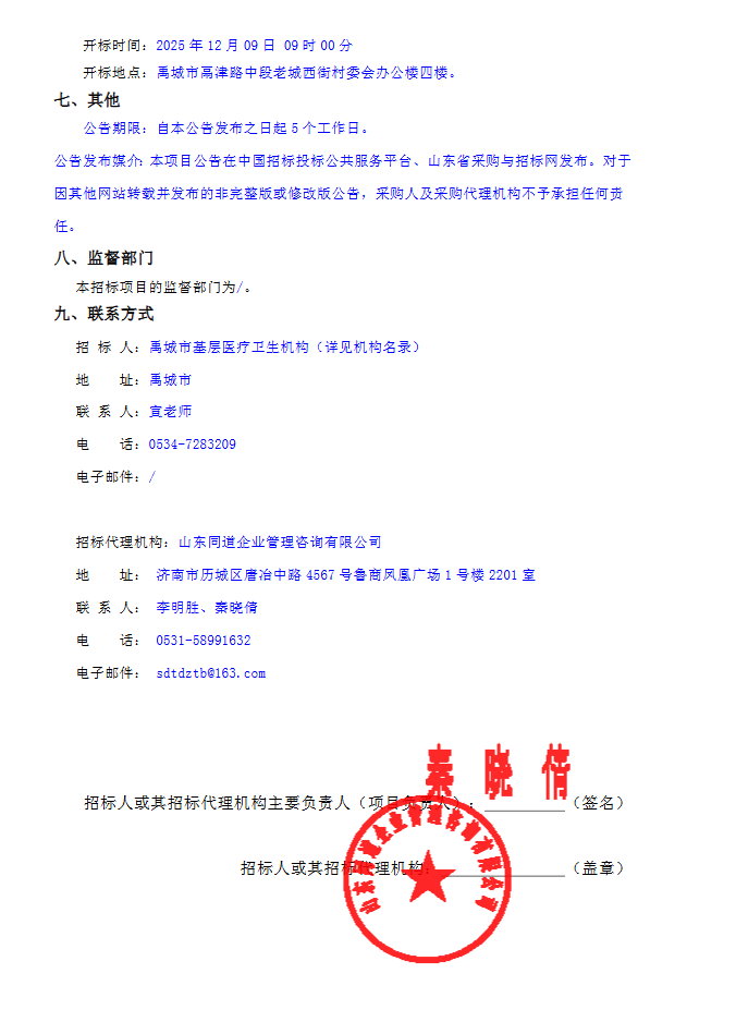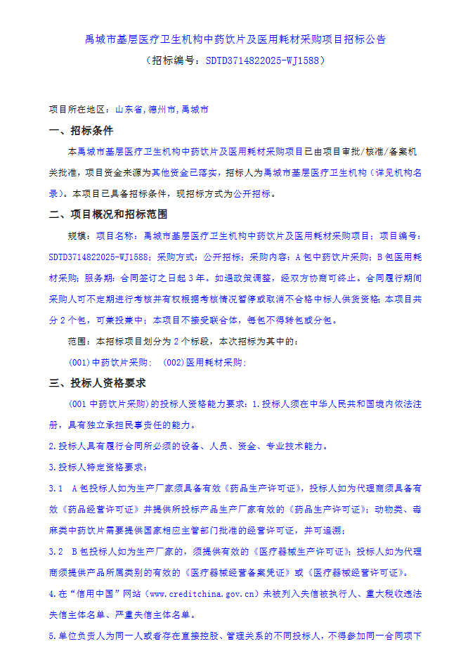【德州市禹城市卫生健康委员会】山东省德州市禹城市基层医疗卫生机构中药饮片及医用耗材采购项目招标公告