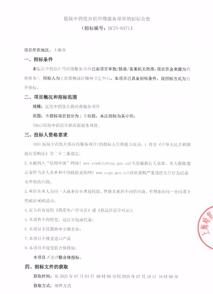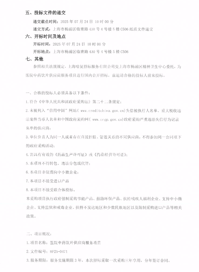 【上海市杨浦区精神卫生中心】上海市杨浦区精神卫生中心医院中药饮片供应商服务项目的招标公告