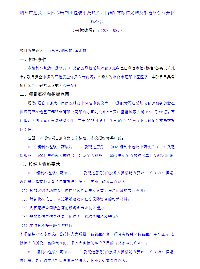【烟台市蓬莱中医医院】山东省烟台市蓬莱中医医院精制小包装中药饮片、中药配方颗粒采购及配送服务公开招标公告