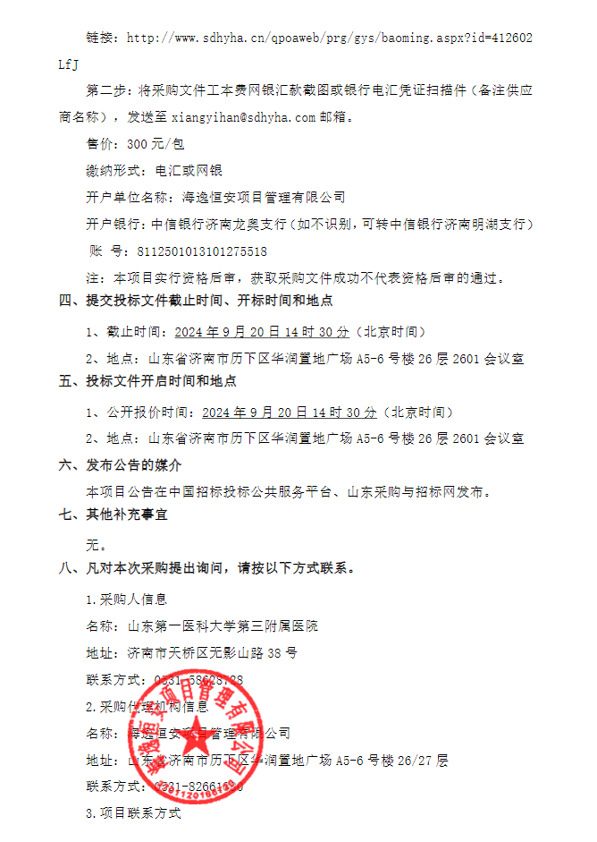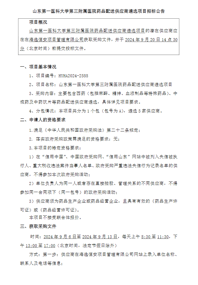 【山东第一医科大学第三附属医院】山东第一医科大学第三附属医院药品配送供应商遴选项目招标公告