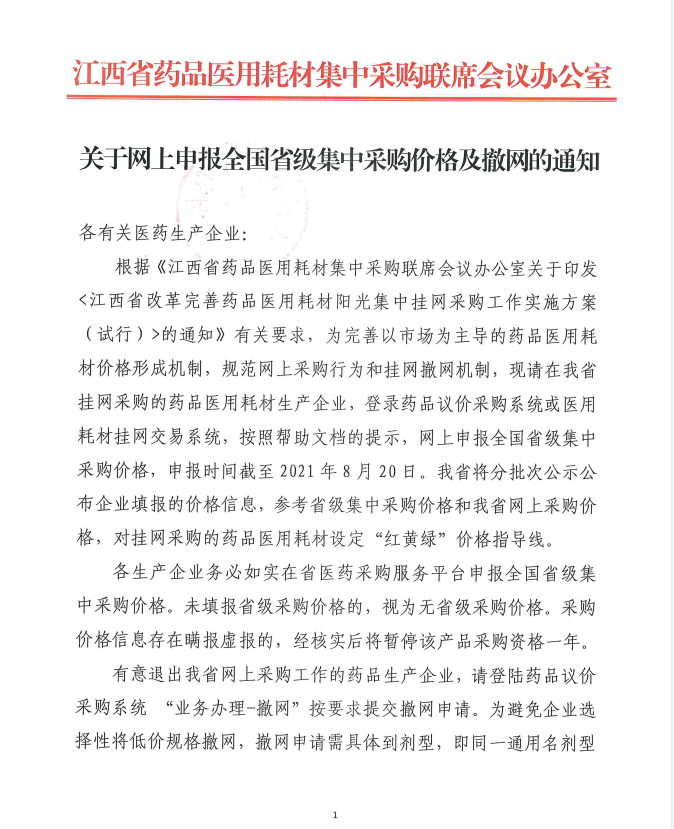 【江西】2021年江西省关于网上申报全国省级集中采购价格及撤网的通知