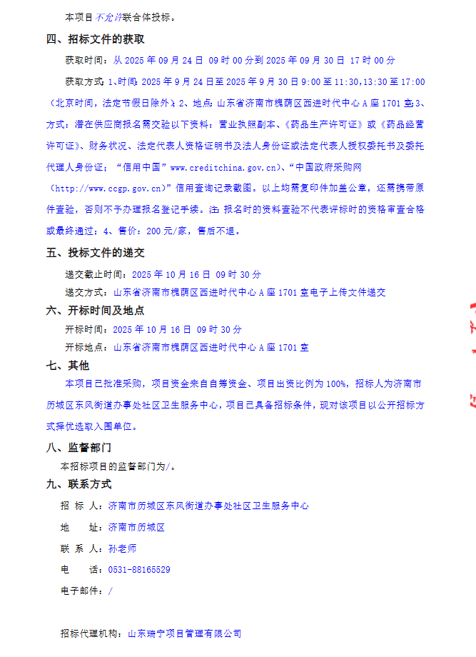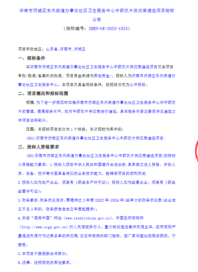 【济南市历城区东风街道办事处社区卫生服务中心】山东省济南市历城区东风街道办事处社区卫生服务中心中药饮片供应商遴选项目招标公告
