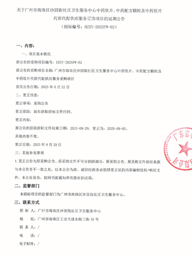 【广州市海珠区沙园街社区卫生服务中心】广东省关于广州市海珠区沙园街社区卫生服务中心中药饮片、中药配方颗粒及中药饮片代煎代配供应服务采购项目的延期公告