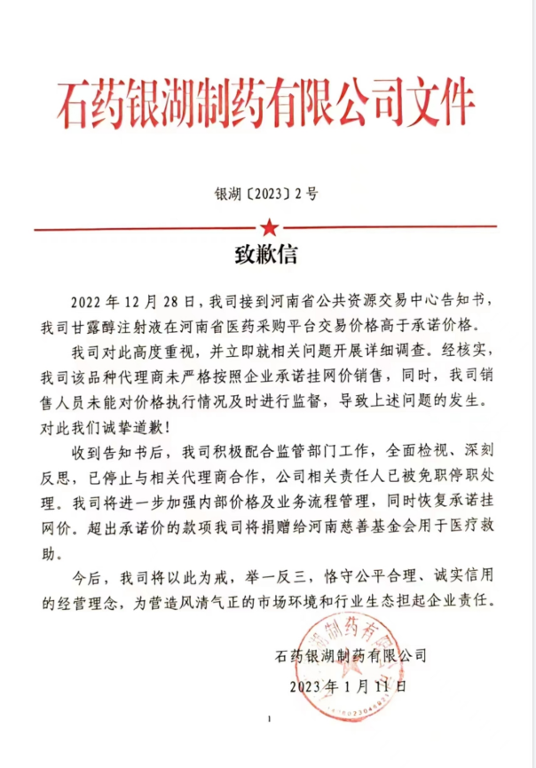 收到告知书后,我司积极配合监管部门工作,全面检视、深刻反思,已停止与相关代理商合作,公司相关责任人已被免职停职处理。我司将进一步加强内部价格及业务流程管理,同时恢复承诺挂网价。超出承诺价的款项我司将捐赠给河南慈善基金会用于医疗救助。