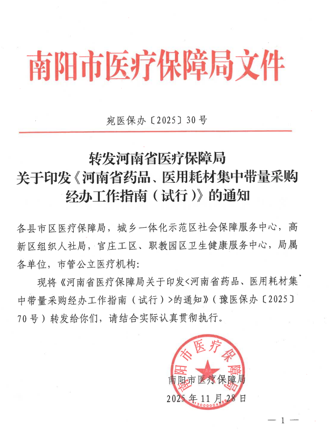 【南阳】宛医保办〔2025〕30号转发河南省医疗保障局关于印发《河南省药品、医用耗材集中带量采购经办工作指南(试行)》的通知