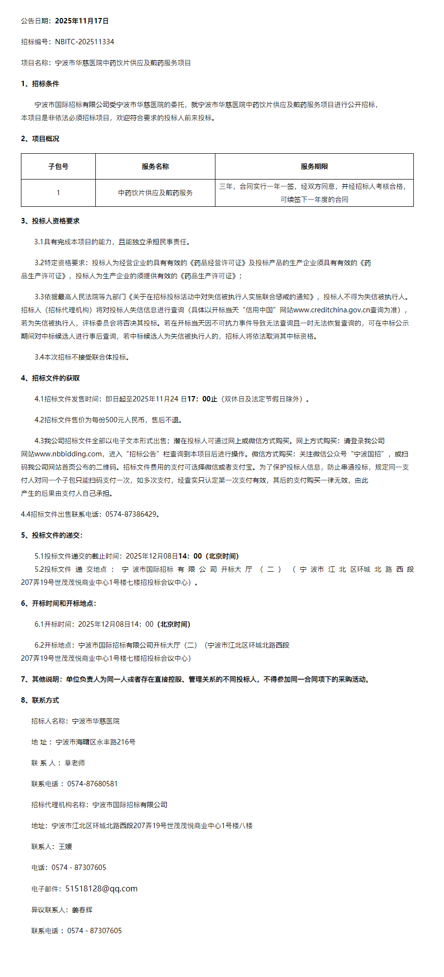 【宁波市华慈医院】浙江省宁波市华慈医院中药饮片供应及煎药服务项目招标公告