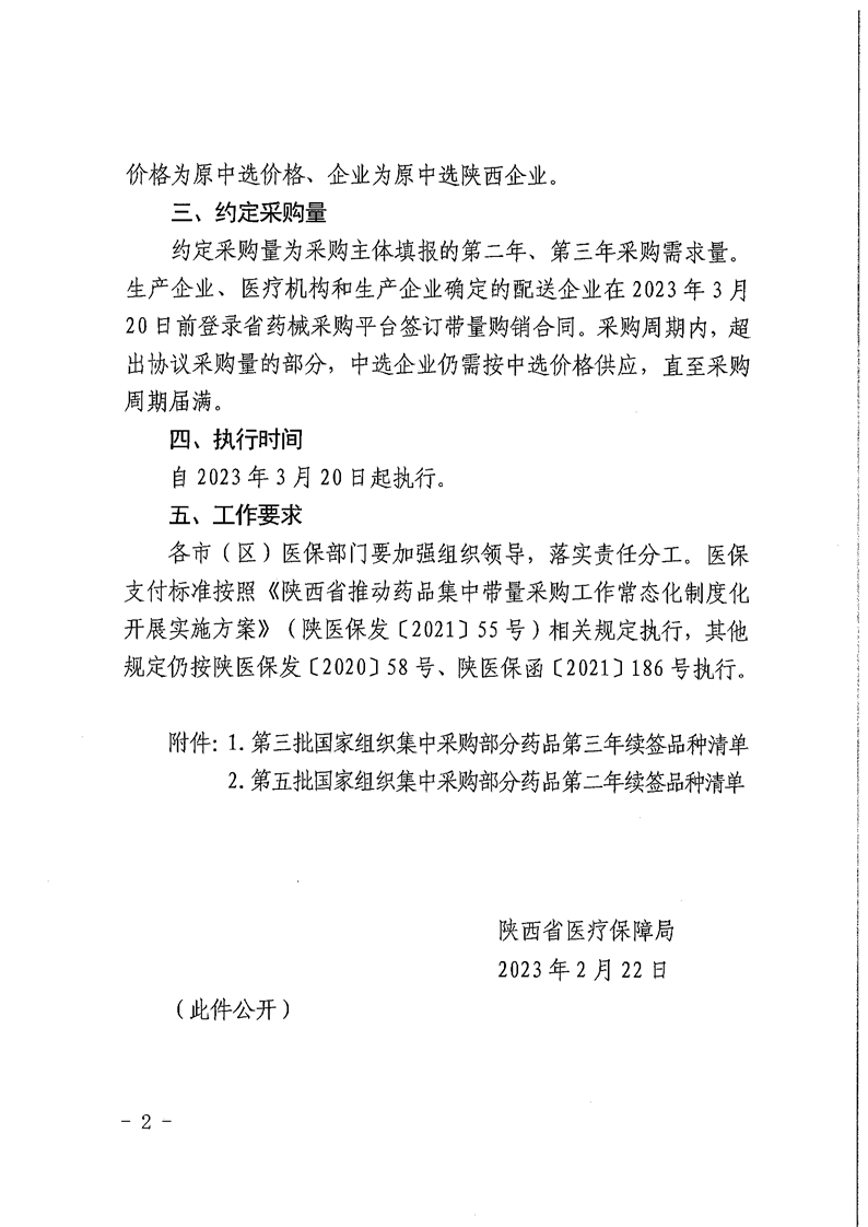 国家组织集中采购部分中选药品采购周期为二年(含)三年(含)以上的供应陕西药品,第二年、第三年采购协议签订执行价格为原中选价格、企业为原中选陕西企业。