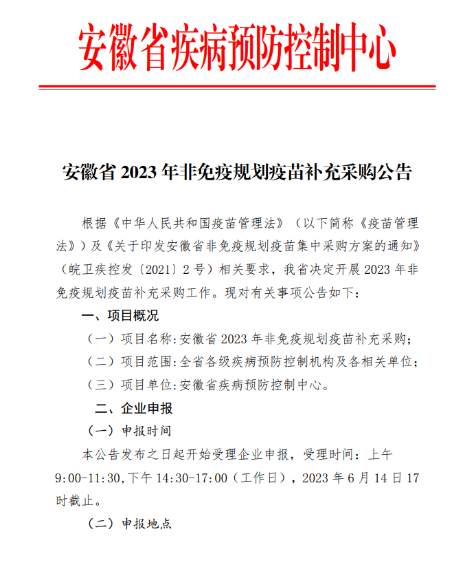根据《中华人民共和国疫苗管理法》(以下简称《疫苗管理法》)及《关于印发安徽省非免疫规划疫苗集中采购方案的通知》(皖卫疾控发〔2021〕2号)相关要求,我省决定开展2023年非免疫规划疫苗补充采购工作。现对有关事项公告如下: