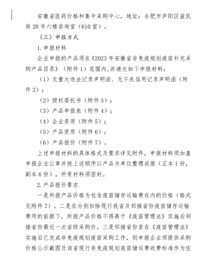 企业申报的产品须在《2023年安徽省非免疫规划疫苗补充采购产品目录》(附件1)范围内,并递交如下申报材料: