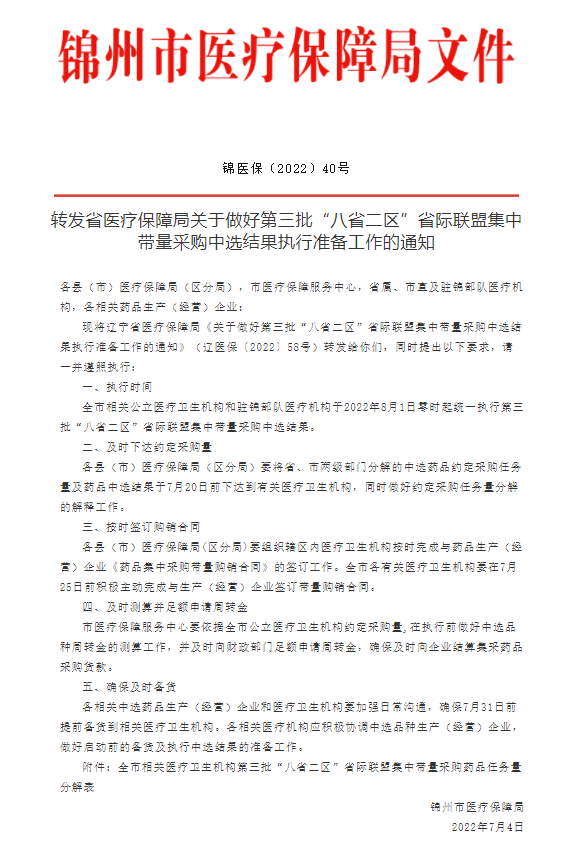 【锦州】转发省医疗保障局关于做好第三批“八省二区”省际联盟集中带量采购中选结果执行准备工作的通知(锦医保〔2022〕40号)