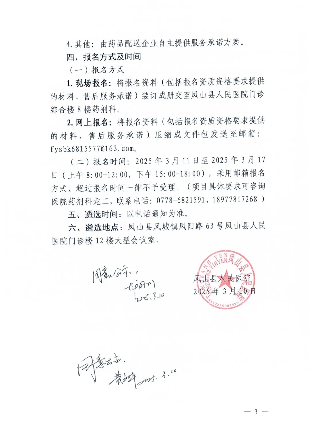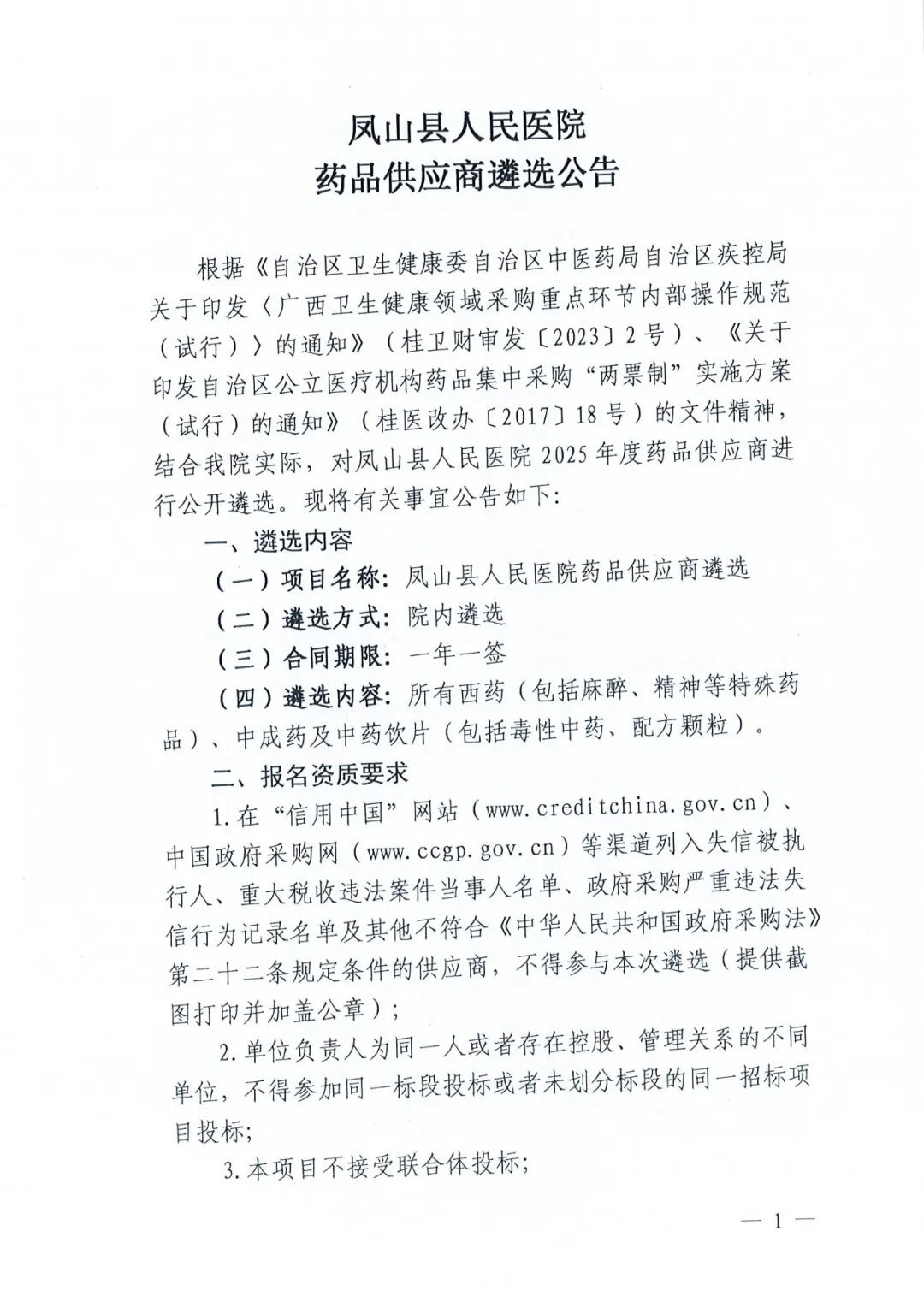 【河池市凤山县人民医院】广西壮族自治区河池市凤山县人民医院药品供应商遴选公告