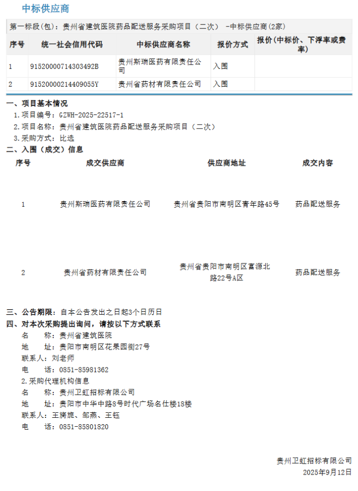 【贵州省建筑医院】贵州省建筑医院药品配送服务采购项目(二次)成交公告